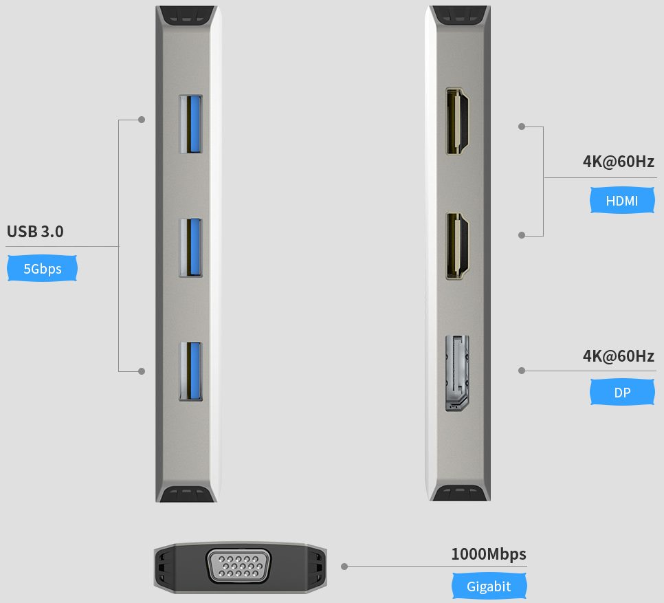 תחנת העגינה כוללת יציאת DisplayPort, שני חיבורי HDMI ויציאת VGA – המאפשרים חיבור של עד שלושה צגים ברזולוציה גבוהה של עד 4K. השילוב המתקדם תורם לתצוגה חדה ומורחבת, אידאלית למשתמשים שזקוקים לשטח עבודה חזותי גדול יותר – בין אם לעבודה משרדית, עריכת תוכן או ניהול מספר משימות במקביל.