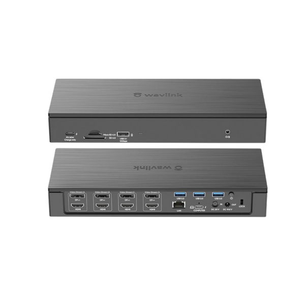 1 x USB-C(PD 30W) | 1 x USB-C(host: PD 100W) | 4 x DisplayPort | 4 x HDMI | 1 x USB-A 3.1(10Gbps) | 3 x USB-A 3.0(5Gbps) 1 x 2.5G Ethernet Port | 1 x DC In(20V/9A 180W) | 1 x Security lock | 1 x Audio/Mic Port | 1 x SD/TF Card Slot | 1 x DC20V/9A 180W USB-C upstream: USB3.1 Gen2 (10G Data and PD3.0 Charging) | DP/HDMI: 4K/60Hz USB3.1 Type-A : 10Gbps | USB3.0 Type-A : 5Gbps RJ45: 2.5Gbps Ethernet 4-pole Phone Jack: TRRS / Stereo SD / TF: SD V4.0 USB-C downstream: PD3.0 30W |
